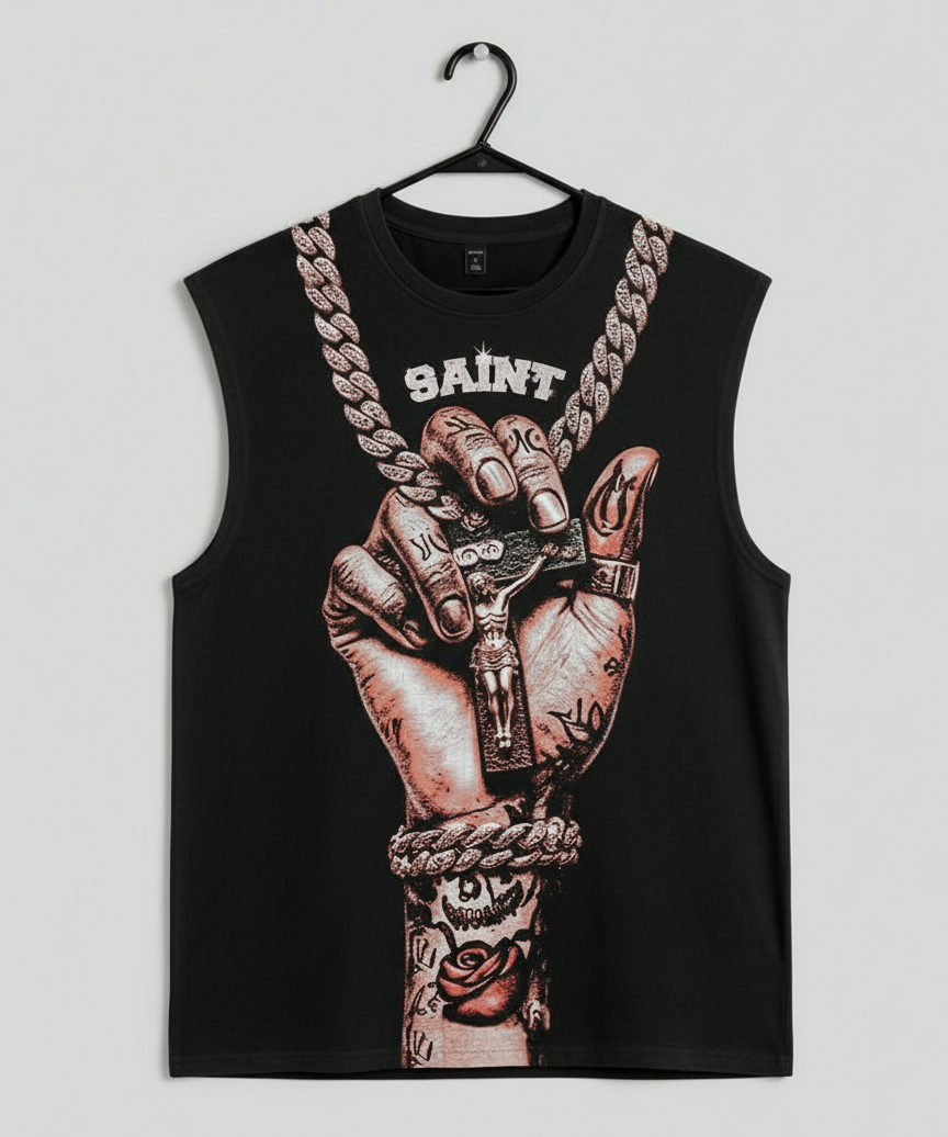 Turn heads with the Saint Graphic Oversized Sleeveless T-Shirt, made from premium 240 GSM French Terry Cotton that delivers a heavyweight yet breathable feel. The bold hand-and-chain graphic with “SAINT” lettering adds a powerful streetwear edge, while the sleeveless box fit ensures all-day comfort and freedom.